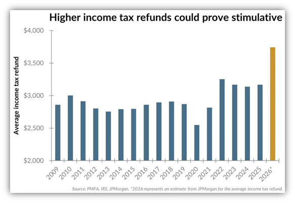 1. Tax cuts will result in rising tax refunds early this year, stimulating consumer spending. JP Morgan estimates consumers will receive an extra $50 billion – $100 billion because of the tax cuts.