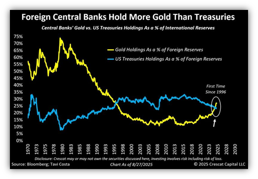 Since 2015 foreign central banks have been increasing their allocation to gold while reducing their allocation to US treasuries. Last August we saw gold surpass US treasuries as a percentage of foreign central bank holdings for the first time since 1996.