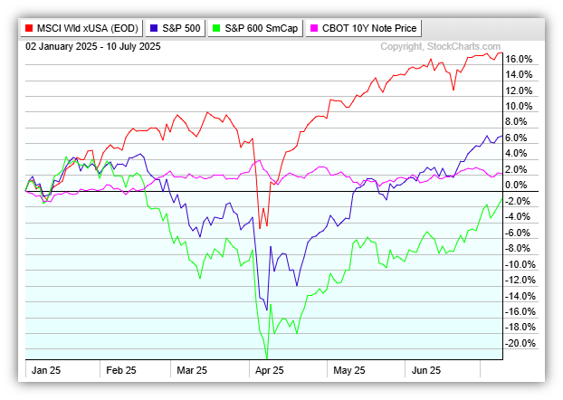 In the past few weeks, the S&P 500 (blue) surpassed its previous all-time high set in February and is now up approximately 7% year to date. However, US stocks remain far behind international indices (red) so far this year. US small company stocks (green) are still negative and bonds (pink) are slightly positive.